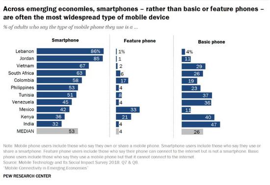 调查发现,11个新兴和发展中国家中,有9个国家,智能手机(能联网和使用Apps)是其成年人群体中使用最普遍机型。其中,智能手机使用率最高的是黎巴嫩(86%)和约旦(85%)。印度智能手机使用率最低,成年用户中,仅有32%。