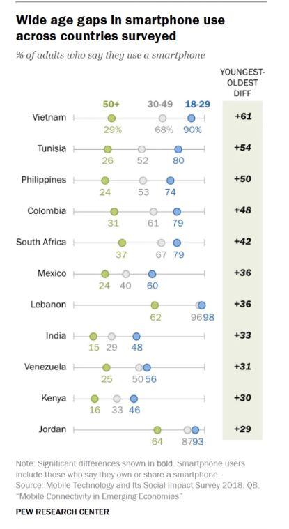总的来说,年轻群体智能手机拥有率远高于老年群体。但值得注意的是,11个国家的50及以上年龄层群体中,约旦有64%的拥有智能手机;印度仅有15%。