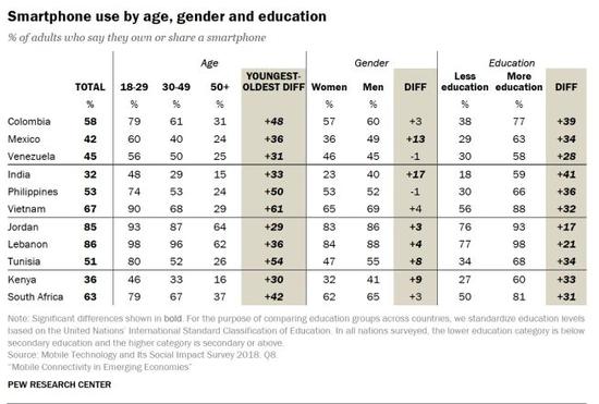 调查发现,在接受调查的11个新兴和发展中国家的成年群体中,有7个国家,目前有一半或超过一半的人使用智能手机。并且,智能手机在年轻群体和中等教育及以上群体中使用更普遍。