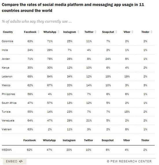 除此之外,2014年被FB收购的信息运用程序WhatsApp也同样深受11个新兴和发展中国家的成年用户欢迎。整体来看,11个国家的成年用户,使用WhatsApp的有47%。