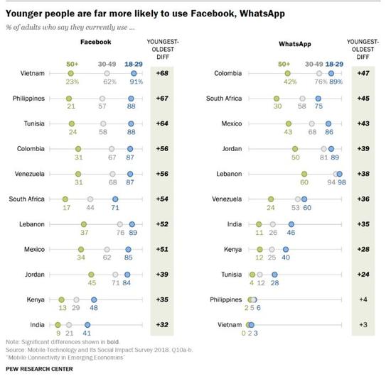 ▲11个国家中,不同年龄层FB和WhatsApp使用情况 (来源:美国皮尤研究中心)