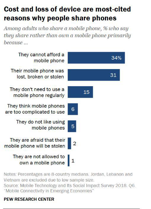在接受调查的8个国家中(由于样本数较少,约旦、黎巴嫩和越南不包括在内),有7%的成年人道出了为什么只与他人共享手机的3个主要原因:支付不起购买手机费用(34%);手机遗失、损坏或被偷(31%);不需要经常使用手机(15%)。