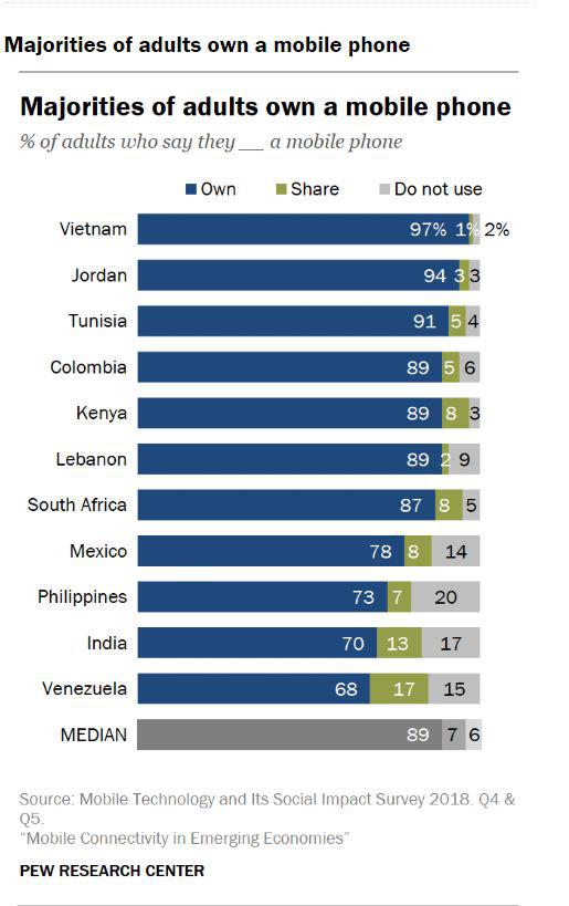 2018年,皮尤数据显示,接受调查的11个新兴和发展中国家的成年群体中,拥有手机比例最高的国家是越南,有97%的越南成年人有手机。拥有手机比例最低的国家是来自南美洲的委内瑞拉(68%),其余32%的委内瑞拉成年人中,17%的与他人共享手机,15%的不用手机。