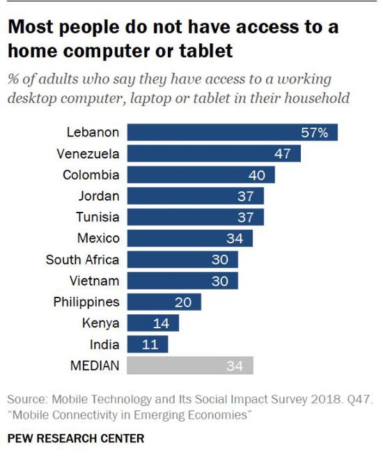 数据显示,11个新兴和发展中国家的大部分成年人能接触到平板电脑或电脑的机会很少。黎巴嫩除外,有超过一半(57%)的家里有台式电脑、笔记本电脑或平板电脑。