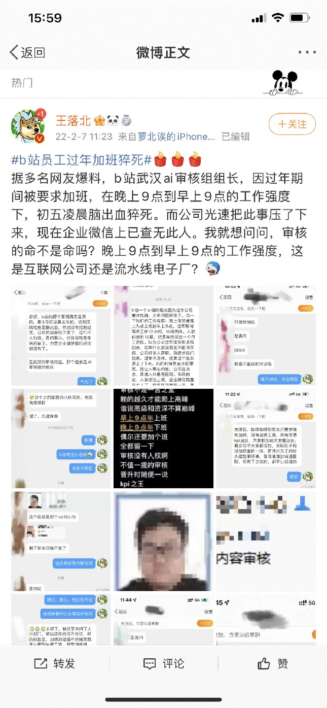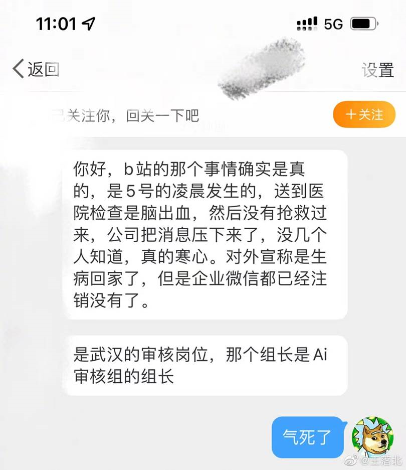 微博认证为“职场博主”的微博用户王落北于2022年2月7日上午11:23发布微博称,“据多名网友爆料,b站武汉ai审核组组长,因过年期间被要求加班,在晚上9点到早上9点的工作强度下,初五凌晨脑出血猝死。而公司光速把此事压了下来,现在企业微信上已查无此人。”