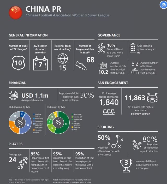 上 游新闻记者从国际足联官方网站上找到近期公布的《国际足联基准报告:女子足球》。报告显示,中国女足的联赛投入是世界第一,俱乐部的平均投入约为185万 美元。另一个数据显示,球队平均薪资投入比例为56%,据此计算可得出平均每个女足俱乐部的薪资大约为103.6万美元。