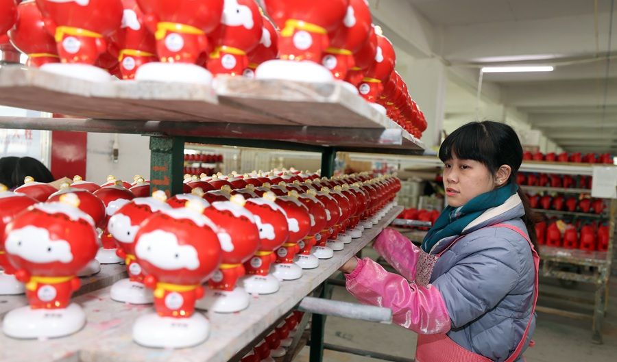 | 工人给陶瓷“雪容融”上色。魏培全摄 |