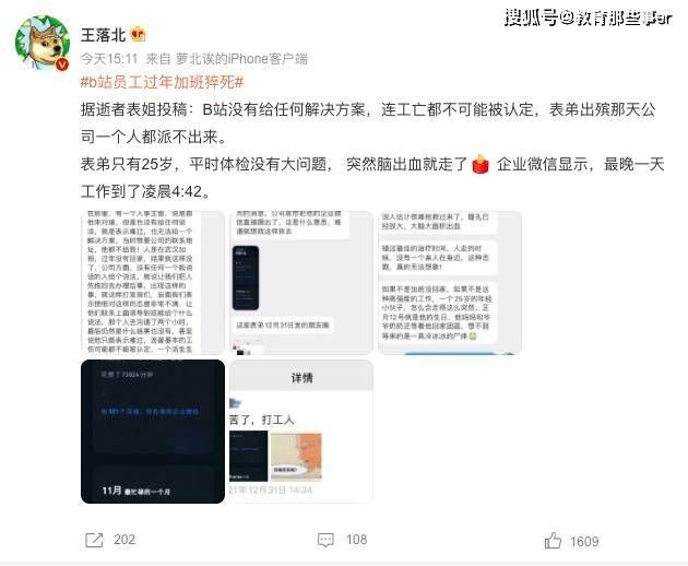日前,新浪微博博主@王落北 曝料称,B站武汉AI审核组组长因过年期间被要求加班,从晚9点到早9点的工作强度下,初五凌晨脑出血猝死。