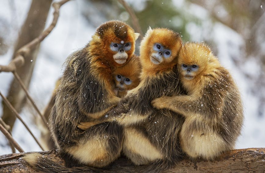 首页 川金丝猴“组团”下山 雪中嬉戏萌态十足 2022-02-09 07:22:03 分享 人民网成都2月8日电 近日,四川省绵阳市平武县黄羊关藏族乡连降大雪。成群的川金丝猴下山,到林中觅食嬉戏。它们时而在雪地里穿行,时而在树梢间跳跃,萌态十足、灵气尽显。川金丝猴,别名狮子鼻猴、仰鼻猴、金绒猴等,常群栖高山密林中,为中国特有的珍稀动物,是国家一级保护动物。四川是川金丝猴的首次发现地,也是栖息地面积最大、数量最多、涉及川金丝猴的自然保护区最多的省份,大约有近万只川金丝猴分布在岷山和邛崃山系。(彭茜、胡宇)