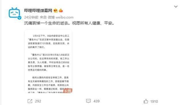 7日,B站发通告称,春节后第一个工作日,要和大家说一件非常难过的事情,内容安全中心图文审核部的伙伴“暮色木心”永远离开了我们。