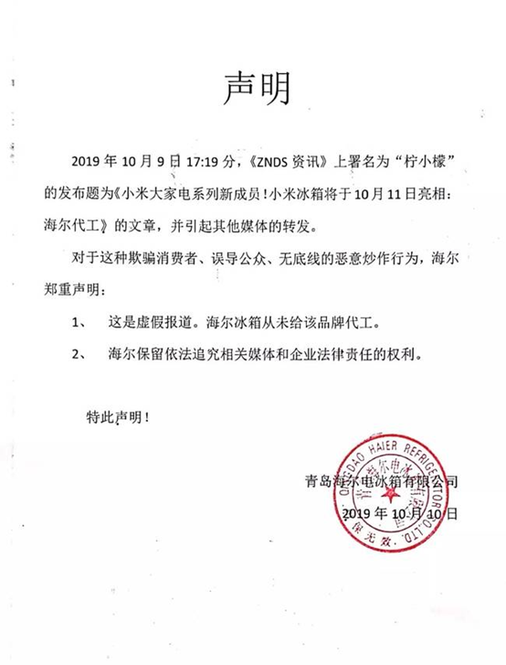 对此,海尔冰箱方面于10月10日发表声明称,海尔冰箱从未给小米代工,此为虚假报道,海尔保留依法追究相关媒体和企业法律责任的权利。
