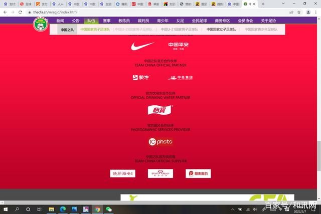 中国足球协会的官网显示,以“中国之队合作伙伴”身份出现的赞助商有9家,其中耐克和中国平安的身份是“高级合作伙伴”,蒙牛和中免集团是“官方合作伙伴”,怡宝是“官方饮用水合作伙伴”,IC photo是“官方图片合作伙伴”,晓琴海参、狮跑锐得、朋来制药等3家的身份为“官方供应商”。在女足的官方感谢名单里,以上9家均有出现。但之前的签约消息显示,小琴海参和狮跑锐得的主要赞助对象是男足,但在官网中,男足的赞助商名单中被单列的只有海澜之家。