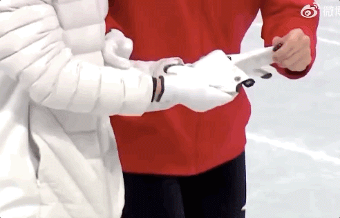 短道速滑队正在上训练课,武大靖与安贤洙并排滑行着,然后他托起了安贤洙的左手,盯着对方的手套看了好久。短道速滑运动员左手手套的五个手指部位,都会粘有树脂或胶质的手指扣,这是为了在滑行过程中用来扶冰,减少摩擦力的。相互比较了一番之后,武大靖迫不及待地将安贤洙的手套拽下来戴在自己手上。