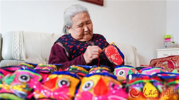 人民网保定2月10日电 大大的虎目炯炯有神,长长的虎须左右分列,周身还绣有精美的花卉图案,整个造型粗犷中透着可爱,充满灵气……春节期间,保定市曲阳县87岁的张翠芬制作了近20双各式各样、款式精美的虎头鞋。