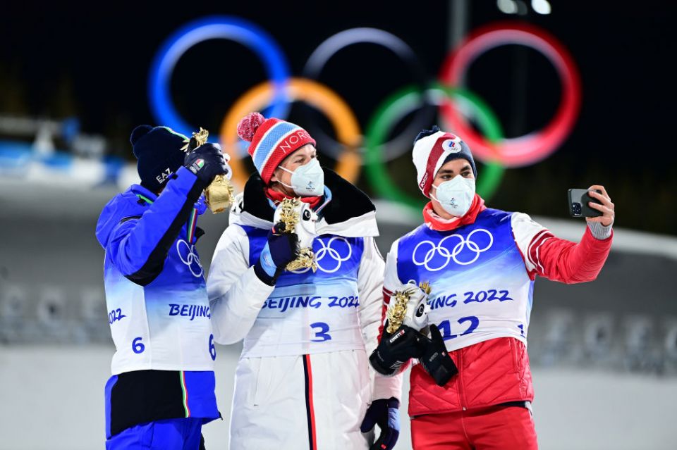 ↑2月8日,越野滑雪男子个人短距离(自由技术)冠军挪威选手约翰内斯·赫斯弗洛特·克莱博(中)、亚军意大利选手费代里科·佩莱格里诺(左)、季军俄罗斯奥委会选手亚历山大·捷连捷夫在颁发纪念品仪式上与金色冰墩墩自拍合影。