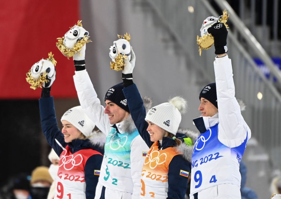 ↑2月7日,跳台滑雪混合团体赛冠军、斯洛文尼亚队选手在颁发纪念品仪式上集体高举金色冰墩墩。