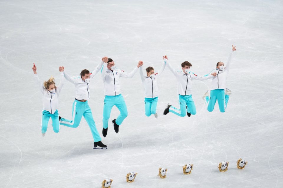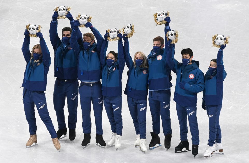 ↑2月7日,花样滑冰团体赛亚军、美国队选手在颁发纪念品仪式上集体高举金色冰墩墩。