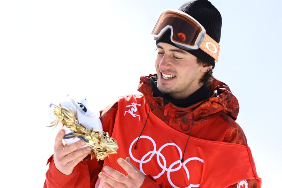 ↑2月7日,单板滑雪男子坡面障碍技巧季军、加拿大选手马克·麦克莫里斯在颁发纪念品仪式上端详金色冰墩墩。