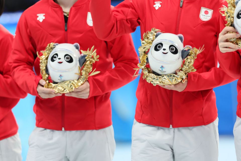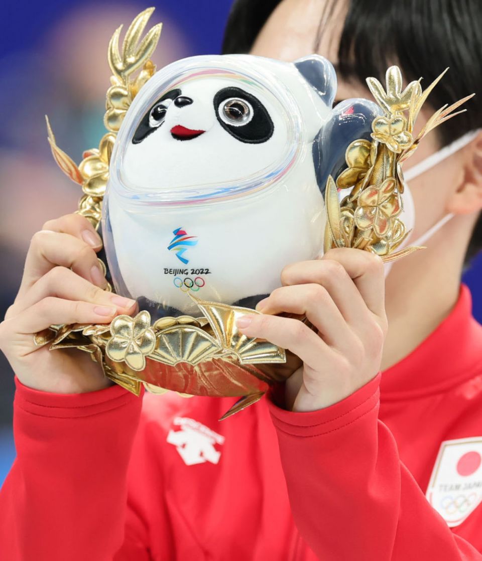 ↑2月7日,花样滑冰团体赛季军、日本队选手在颁发纪念品仪式上手捧金色冰墩墩。