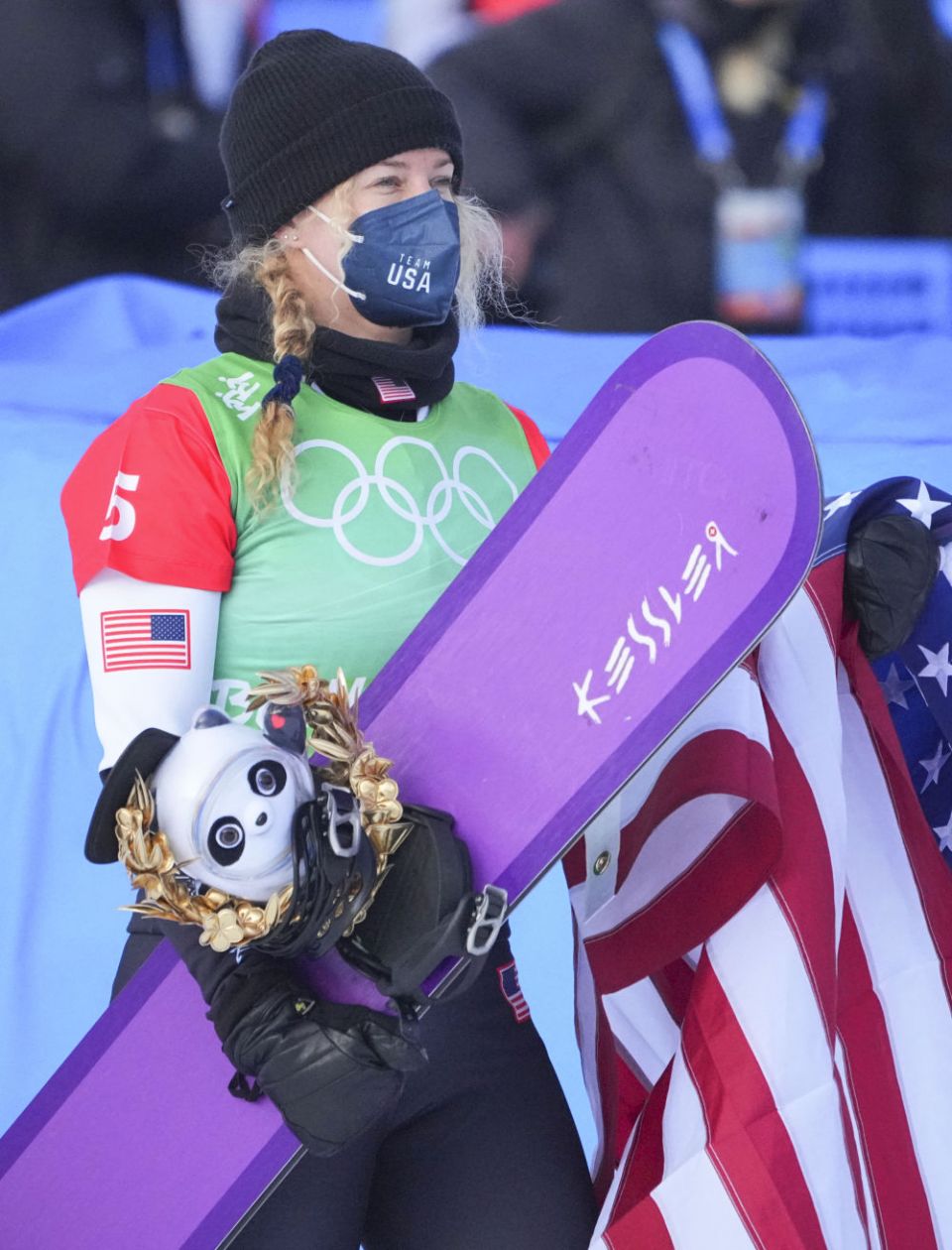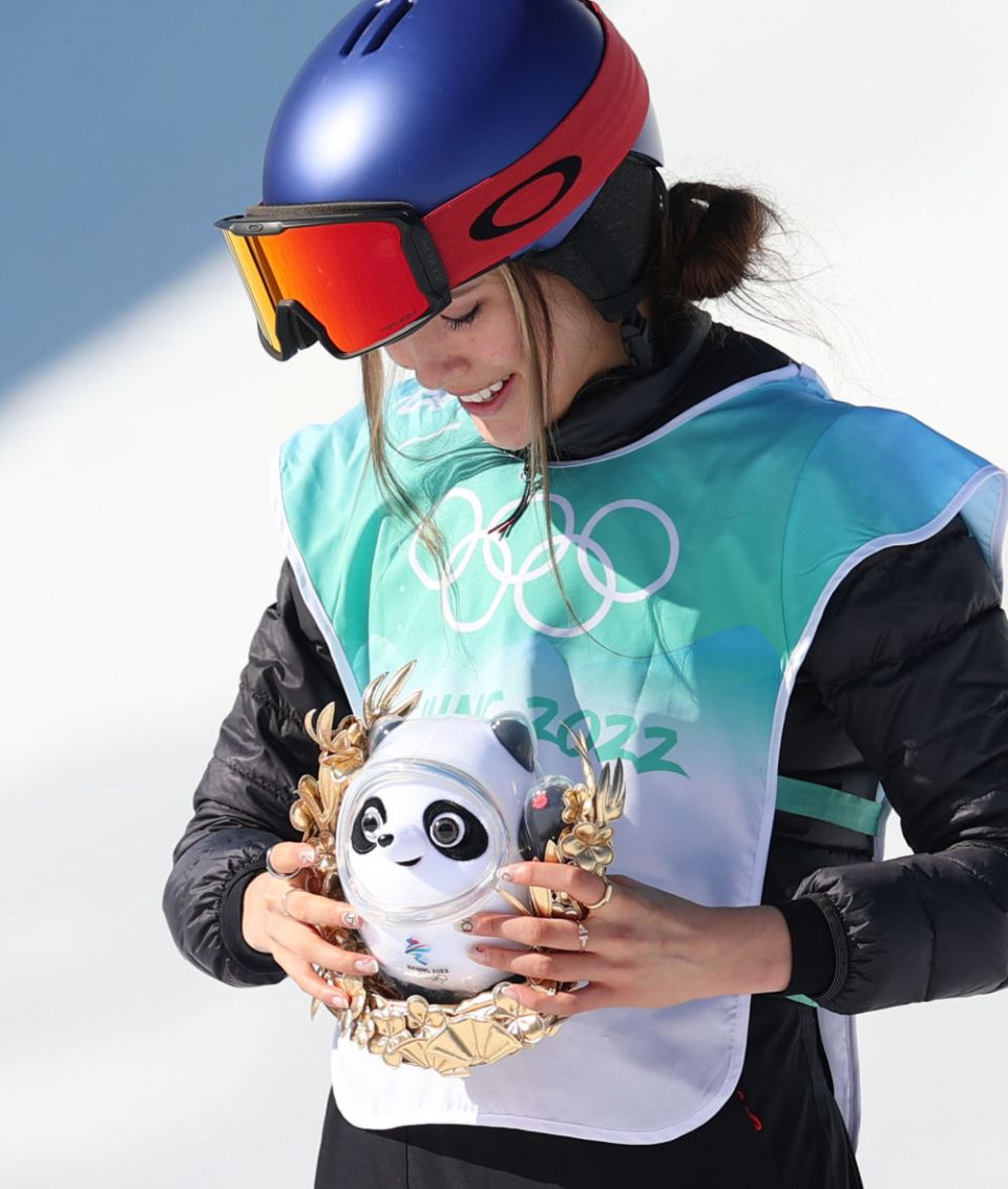 ↑2月9日,单板滑雪女子障碍追逐赛冠军、美国选手琳赛·雅各贝利斯在颁纪念品仪式后带着金色冰墩墩离场。