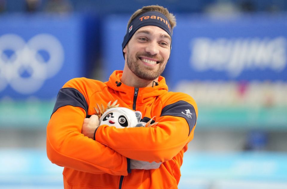 ↑2月8日,速度滑冰男子1500米冠军、荷兰选手凯尔·内斯在颁发纪念品仪式上抱紧金色冰墩墩。 把你捧在手心里