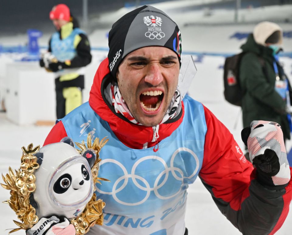↑2月9日,北欧两项个人跳台滑雪标准台/越野滑雪季军、奥地利选手卢卡斯·格赖德雷尔在颁发纪念品仪式上。