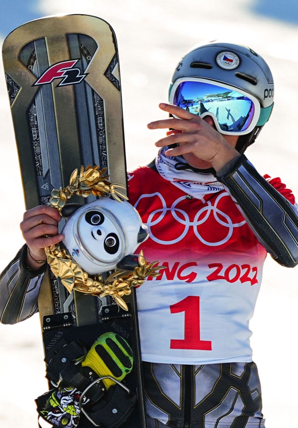 ↑2月8日,单板滑雪女子平行大回转冠军、捷克选手埃斯丝特·莱德次卡在颁发纪念品仪式上。