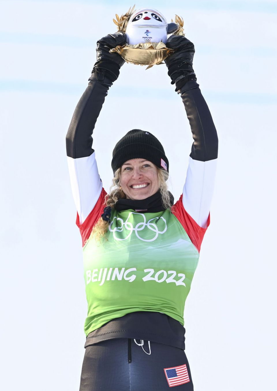 ↑2月9日,单板滑雪女子障碍追逐赛冠军、美国选手琳赛·雅各贝利斯在颁发纪念品仪式上高举金色冰墩墩。