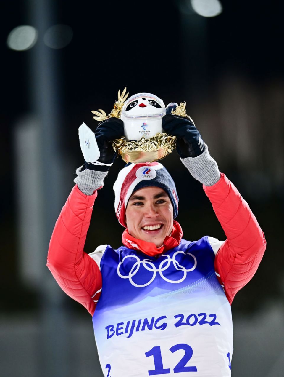 ↑2月8日,越野滑雪男子个人短距离(自由技术)季军、俄罗斯奥委会选手亚历山大·捷连捷夫在颁发纪念品仪式上高举金色冰墩墩。