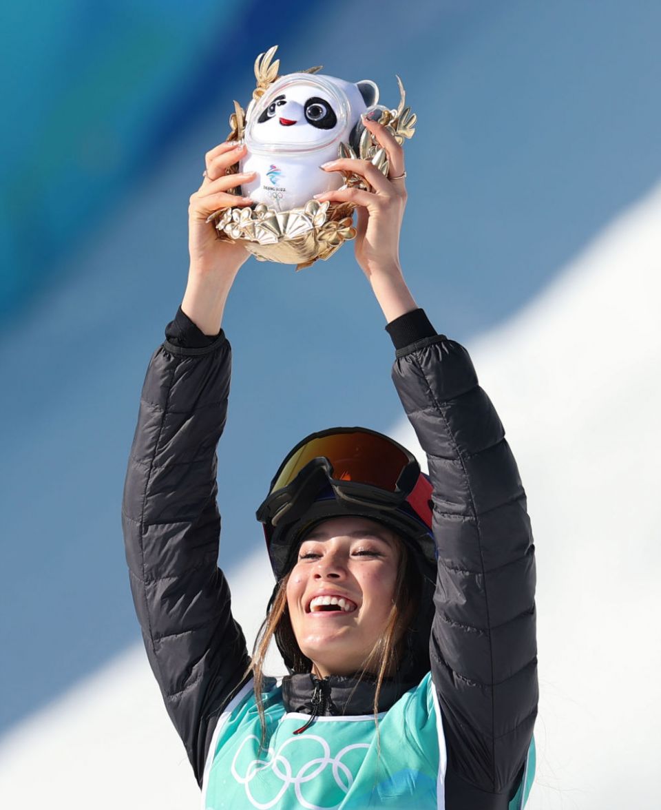 ↑2月8日,自由式滑雪女子大跳台冠军、中国选手谷爱凌在颁发纪念品仪式上高举金色冰墩墩。