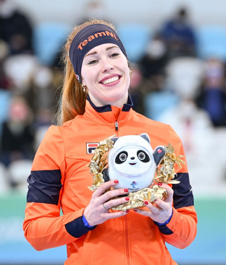 ↑2月7日,速度滑冰女子1500米冠军、荷兰选手伊琳·维斯特在颁发纪念品仪式上亲吻金色冰墩墩。