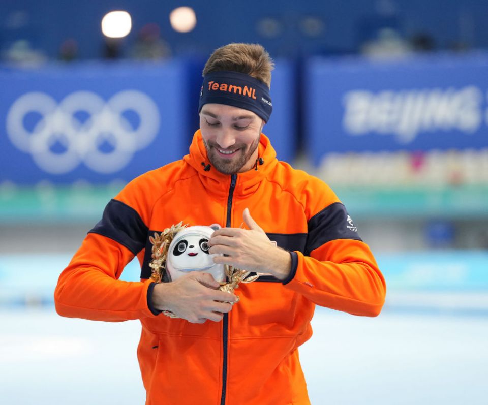 ↑2月8日,速度滑冰男子1500米冠军、荷兰选手凯尔·内斯在颁发纪念品仪式上看着手中的金色冰墩墩。