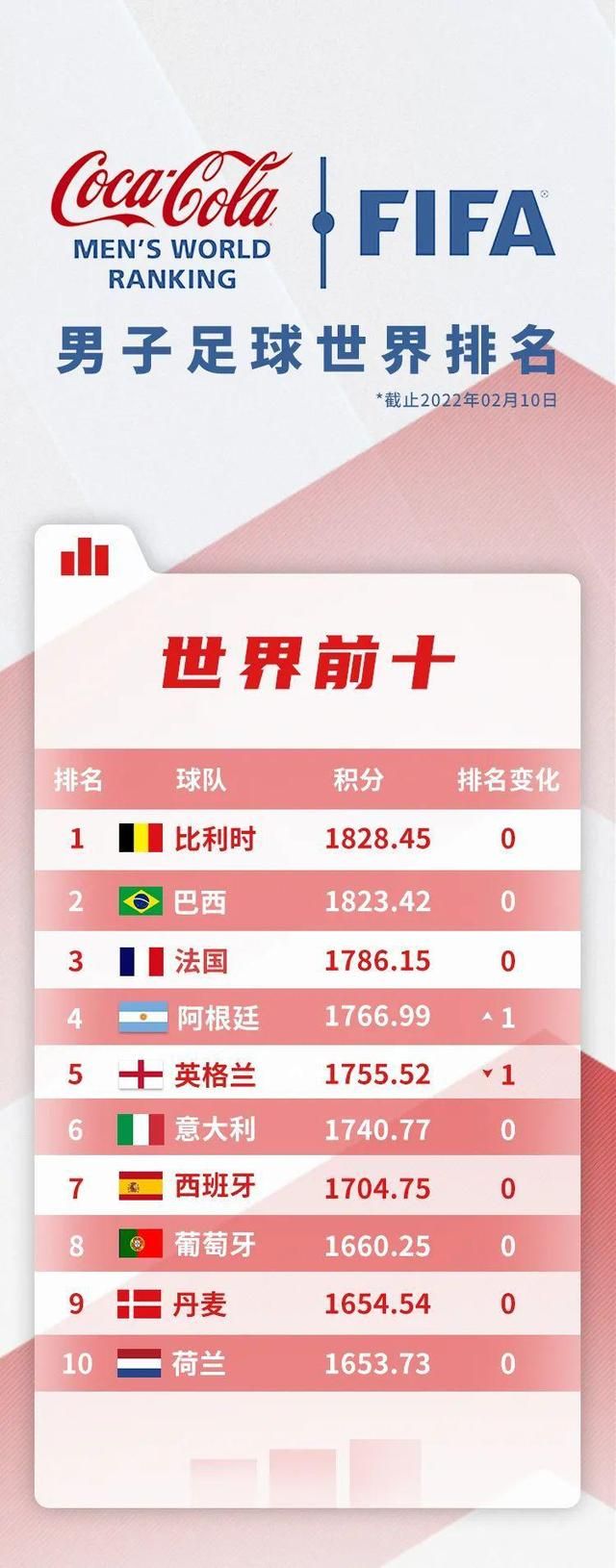 首页 FIFA最新排名:中国男足下降一位排第75,亚洲第9 2022-02-11 10:51:43 分享 据FIFA国际足联微博消息,2022年首期FIFA男足世界排名公布:“欧洲红魔”继续强势霸榜,“潘帕斯雄鹰”上升一位排名第四;中国队本期排名第75位,相比上期下降了一位,排名亚洲第九。来源:人民日报客户端