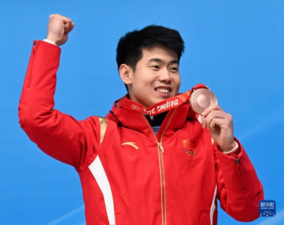 2月11日,中国选手闫文港在奖牌颁发仪式上。