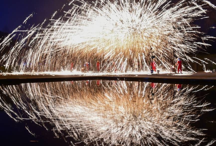 科创 河南洛阳:火龙翻腾舞佳节 2022-02-13 08:11:49 分享 民间艺人在河南省洛阳市隋唐城遗址植物园景区表演非遗技艺“打铁花”。黄政伟摄人民网洛阳2月12日电(尚明桢)近日,河南省洛阳市举行非遗技艺“火龙舞铁花秀”贺新春迎元宵佳节民俗活动,“菊花凌空绽放”的恢宏场面,吸引众多游客前来观赏,营造出浓浓的节日氛围。非遗技艺“打铁花”是国家级非物质文化遗产,有“民间焰火之最”等美誉,已有千余年历史。表演时,民间艺人们将白铁块烧至千度以上,舀出铁水抛向空中,用蘸过水的木锨奋力击打,铁水四散,璀璨绚丽的铁花呈现出“火树银花不夜天”的景象,颇为壮观。
