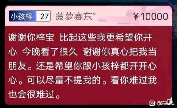 随后,部分激进的粉丝将事件上升到主播为了现实好友,要与支持她的粉丝切割的地步,随着事件的进一步恶化," 菠萝赛东。" 本人似乎坐不住了,进入直播间并直接打赏 10000 元让 " 阿梓 " 不要再在直播中提到自己,以免伤害了她与粉丝之间的感情。