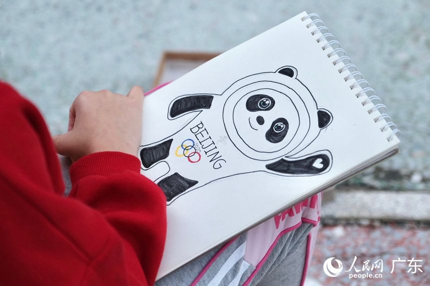 小学生展示已经画好的“冰墩墩”。人民网 马晓楠摄