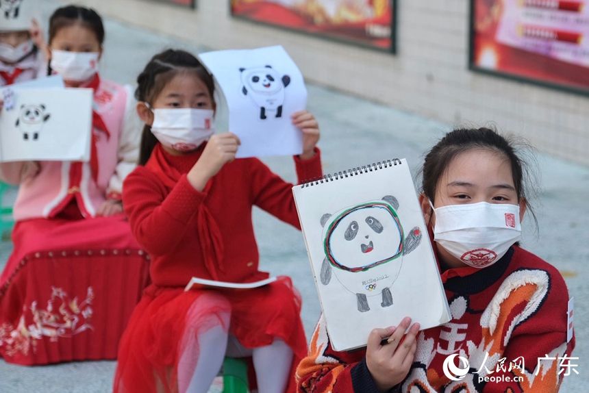 小学生们展示已经画好的“冰墩墩”。人民网 马晓楠摄