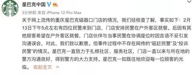 2 月14日傍晚6时许,“星巴克中国”官微发布声明称,“关于网上流传的重庆星巴克磁器口门店的情况,我们经核查了解,事实如下:2月13日下午5点左右有 四位民警来到门店,门店安排民警在户外客区就餐。后因有其他顾客希望在户外客区就餐,门店伙伴与当事民警在协调座位时因言语不妥引发沟通误会,对此,我们 致以歉意。但事件过程中不存在网传的“驱赶民警”及“投诉民警”的情况。星巴克一直致力于扎根社区、服务社区,门店一直以来与所在地的警方沟通良好,得到 警方的大力支持。星巴克一如既往地欢迎每一位顾客的光临。”