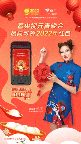 央视2022年元宵晚会将于 2月15日(正月十五)晚8点开始,晚会播出期间,京东将推出“看央视元宵晚会,最高可领2022元红包”互动活动。届时,只要跟随主持人口播提示,打开京东APP“摇一摇”,即可参与“摇一摇得福利”、“击鼓拿福利”、“邀请好友得福利”三大互动活动,并有机会领取最高2022元红包,以及21金维他健康好礼、京造颈部按摩仪、添可洗地机、飞利浦剃须刀、小米吹风机、元宵时尚好礼等实物大奖。