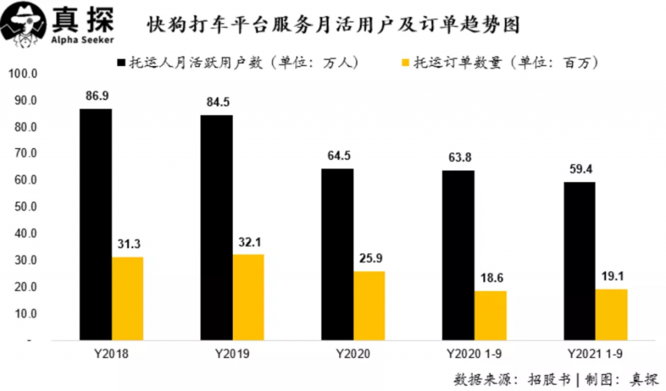 招股书显示,快狗打车在对C端的平台服务方面,托运人平均月活跃用户数从2018年的86.9万,下降至2020年的64.5万,降幅达到25.8%;而进入2021年前9个月,这一数据仍然在持续下降,仅为59.4万,同比下降6.8%。