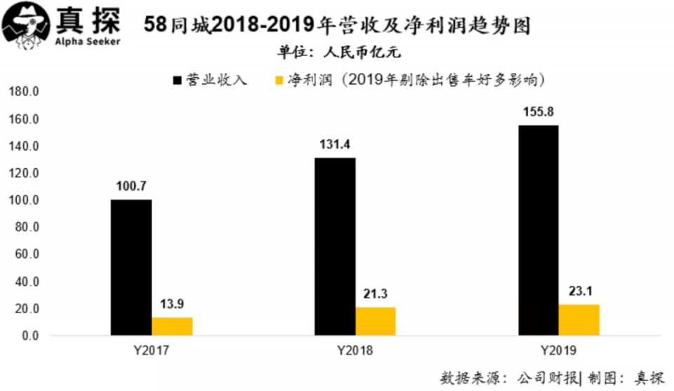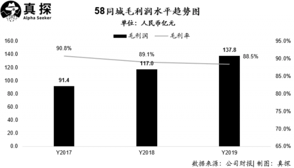 即使在58同城退市前发布的最后一份年报中,集团2019年全年实现营收155.8亿元人民币,剔除掉出售车好多股权利得后,全年实现净利润23.1亿元。而同时,在2017-2019年之间,58同城毛利率水平更是高达90%左右,远超市场上公认最赚钱的几家互联网大厂水平。