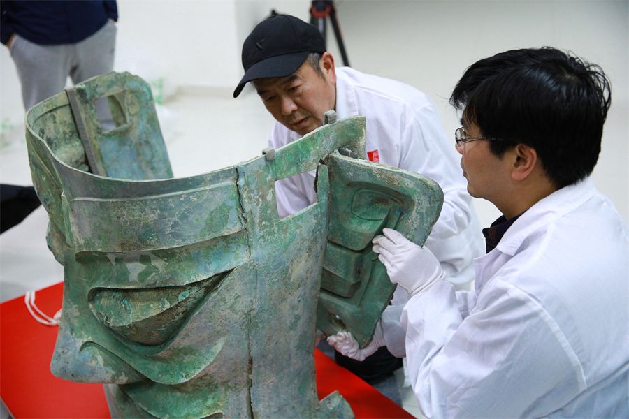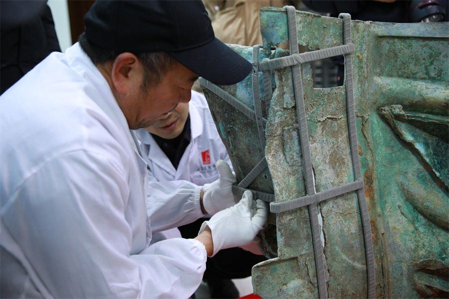 工作人员正在对青铜大面具进行加固