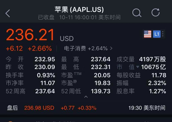 此前,受到市场需求超预期促使苹果把iPhone 11系列手机的产量提高10%的推动,10月5日苹果市值再度超过1万亿美元关口后,接连几日上涨,已让苹果市值突破历史新高。