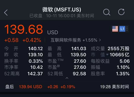 大型科技股全线上扬,苹果大涨2.66%,再创收盘历史新高,市值达1.0675万亿美元,超越微软1.0665万亿美元市值,重回市值第一宝座。