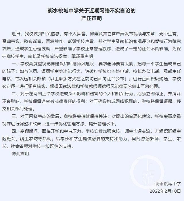 据悉,在该事件发酵前,2月10日桃城中学发布声明,称指责学校体罚、语罚学生等违纪行为系无中生有,如果有可以拨打学校相关电话正面沟通;对于网络上给学校造成负面影响和伤害的个人和相关行为,学校保留追究其法律责任的权利。