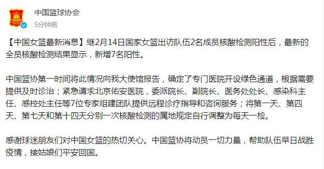 继2月14日国家女篮出访队伍2名成员核酸检测阳性后,最新的全员核酸检测结果显示,新增7名阳性。