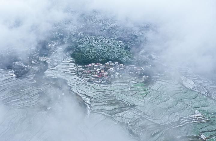2022年2月18日,安徽省宣城市旌德县白地镇,梯田银装素裹,在云雾间若隐若现,美不胜收。江建兴摄(人民图片网)