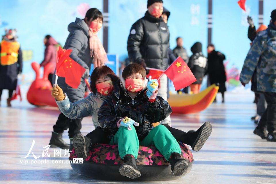 近日,河北省张家口市桥东区全民冰雪运动升温,市民踊跃参与滑冰、拔河、雪圈、冰车等冰雪运动及游戏项目。岑屹摄(人民图片网)