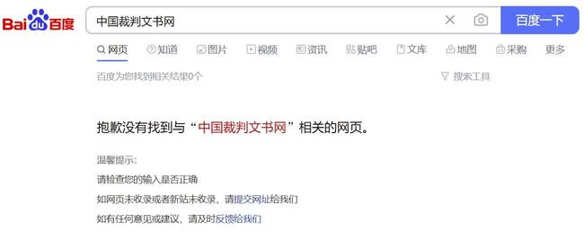 根据网友发布的截图显示,在百度搜索中国裁判文书网,显示的结果为“抱歉没有找到与中国裁判文书网相关的网页”。